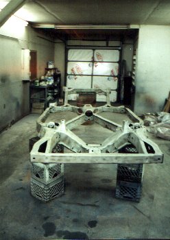 Here's the frame after a dozen bags of sandblasting fun. And then after 3 quarts of chassis black paint.