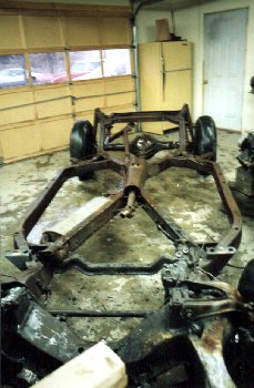 Here's the chassis without the engine after it was rolled out from under the elevated body. It had spent a couple of hours out in the freezing rain before I cleared enough space to get it inside. Its 17 feet long. At this point space was at a minimum.