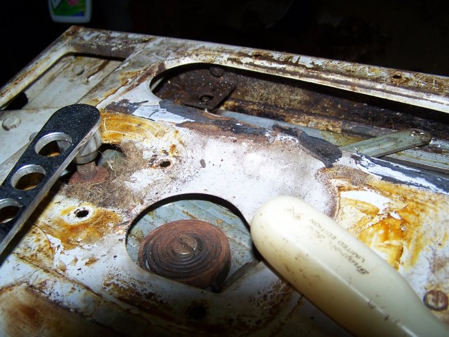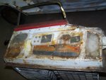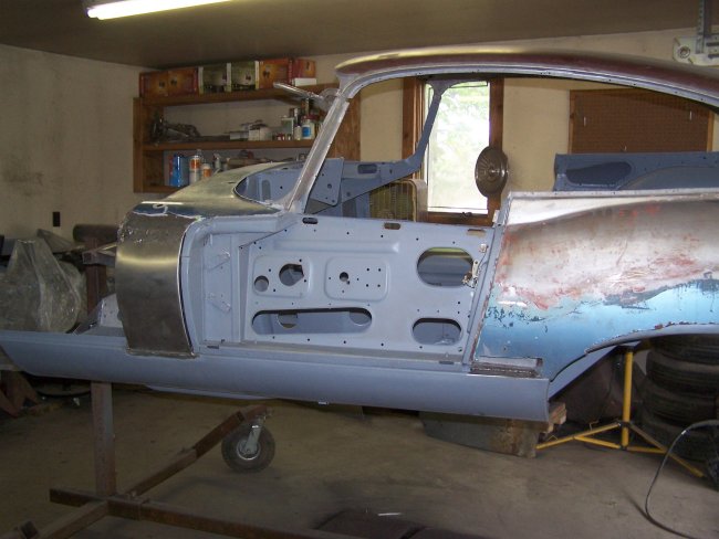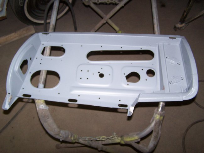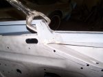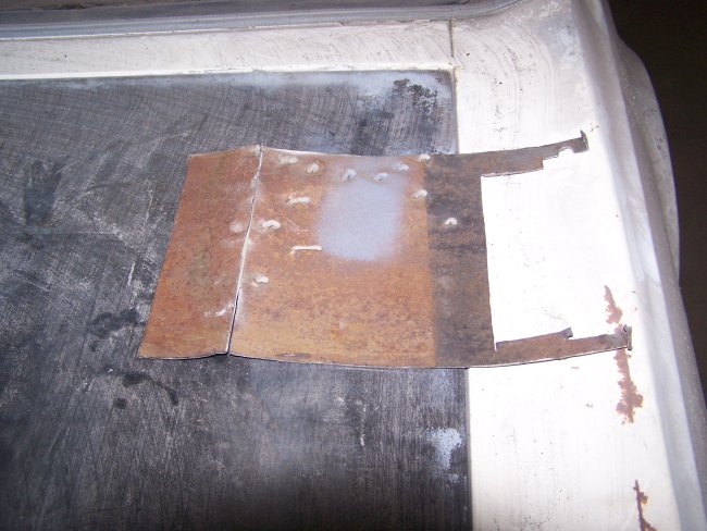 since it was only spot welded in a few locations. To remove the upper gutter, I had to drill out the rivets and use torches to melt the braze. The shell was then sandblasted. It was then primed on the inside along with the backside of the new door skin.