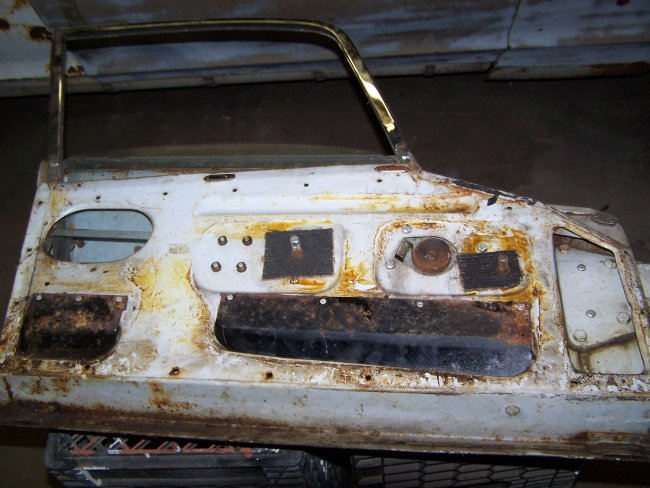 The door reskinning process began with me dismantling the door. It's a good idea to take a lot of pictures. In the first picture you can see one of the very few non-original parts on the car. At some point someone had replaced the