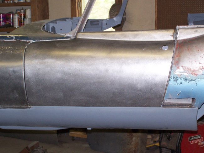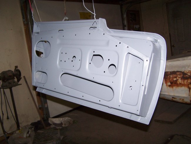factory. Note: For the spot weld to work, primer had to be removed from the backside of the skin and on the lip of the door so that a good electrical contact could be made. The second picture is a view showing the lower gutters, which were a pain to install because my rivet gun could not be positioned at the angle that was necessary to pop the rivets. I had to pop them at the wrong angle and then hammer and dolly them into the correct orientation. Once that was done the bottom corners were spot welded to the lip like original. With that done, the door and hinge was removed for priming. The last picture shows the door back in place. You can also see the installed side panel, which had not yet been primed since it needed to be bare steel for the lead loading process. | ||