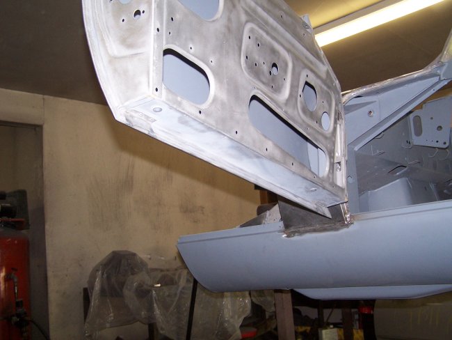 I am going to have to be real careful when putting them back in once the car is painted so that I don't scratch the paint. In the last picture there is a black area where the hinge was bolted. The absence of paint tells me that the car was painted with the doors installed. I will probably leave the doors off for painting so that there isn't a mask line around the door openings. | ||