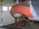 With the doors reskinned, I turned to the rear wings. The right side was not only rusted out, but had also suffered from a previous accident (which was poorly repaired as well, see above).