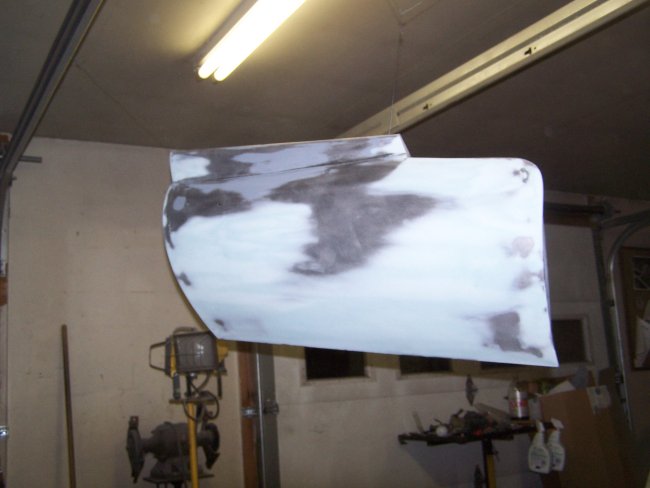 picture you can see a couple pieces of tape that I used to mark the low spots. It was only an afternoon's work to get the roof in primer. For the underside of the roof, I had to treat with a rust converter prior to priming. | ||
