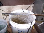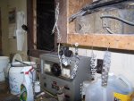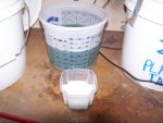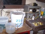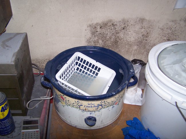 shows the screws after polishing. The zinc plate will look hazy and dull if the parts aren't polished first. I then dropped the screws in my cheap Wallmart $12 crockpot which was filled with a degreaser solution made from a powder supplied with the zinc plating kit. After sitting in the degrease for 15 minutes the parts were soaked in distilled water until I was ready to plate them shortly after. Just before plating the screws were pickled (submerged in a solution of phosphoric acid) to desolve any rust in the areas that sandblasting could not reach. The Phostphoric acid is available as a concrete cleaner at Home Deport. In the last picture above you can see my container of diluted phosphoric acid. I poured the acid in the little container with the screws. The acid started foaming right away. After setting for a couple minutes I drained of the acid and rinsed the screws with distilled water. | ||