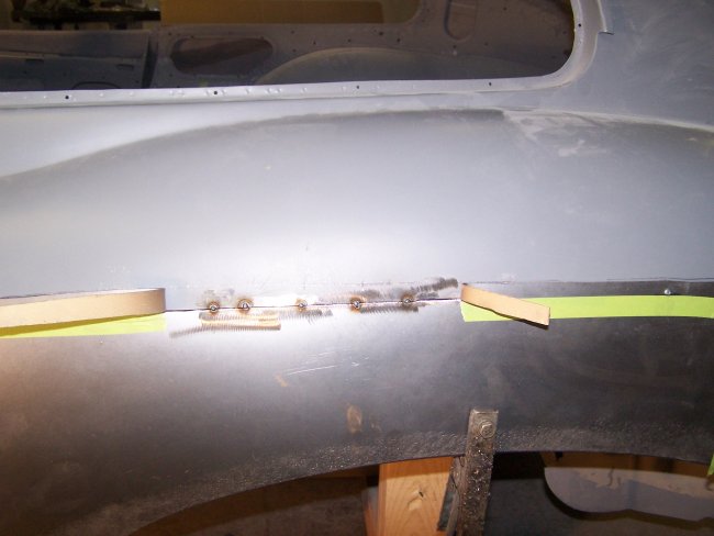 The butt-welding process is discussed more thoroughly on my Mustang pages, but here it is in a nutshell. First you clamp the new panel over the old panel. In this case I used rivets. Then I
