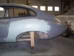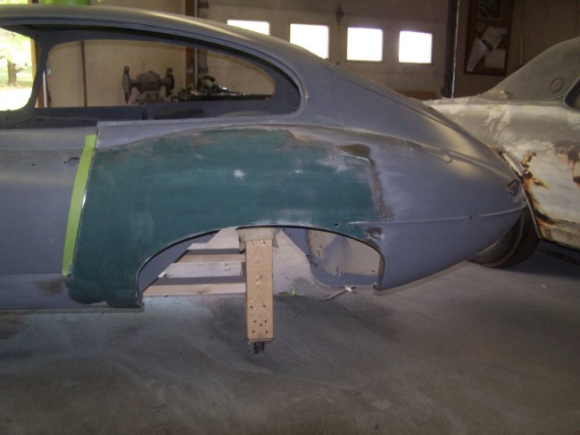 Since the joint at the rocker came out pretty even, I did not bother with lead on this side. I gave the whole panel a skim coat of Evercoat fiberglass filler, sanded it down and gave it a scratch
