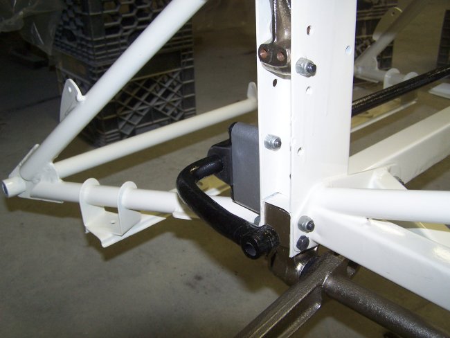 13) The upper wishbone brackets should be installed at this time. They insert into channels on the sides of the picture frame. The bottom bolt should be left loose on each bracket since they also are used as mounting points for wiring harness hold-downs. The center bolt hole on each bracket is for the steering rack mount, so no bolt will go in the centers at this point.