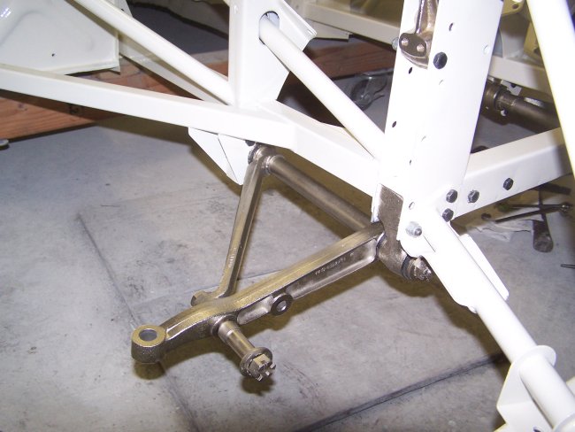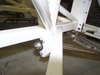 14) The lower wishbones must be fully assembled and have the pivot nuts tightened in order to fit into the frames. There are two important items in this picture to keep in mind. The upper outboard bolts are left out, since they are the mounting points for the anti-roll bar. The bottom outboard bolts are inserted from the back to the front, since that is the only way to get a nut onto them. At this point the inner bonnet support bolts can be installed.