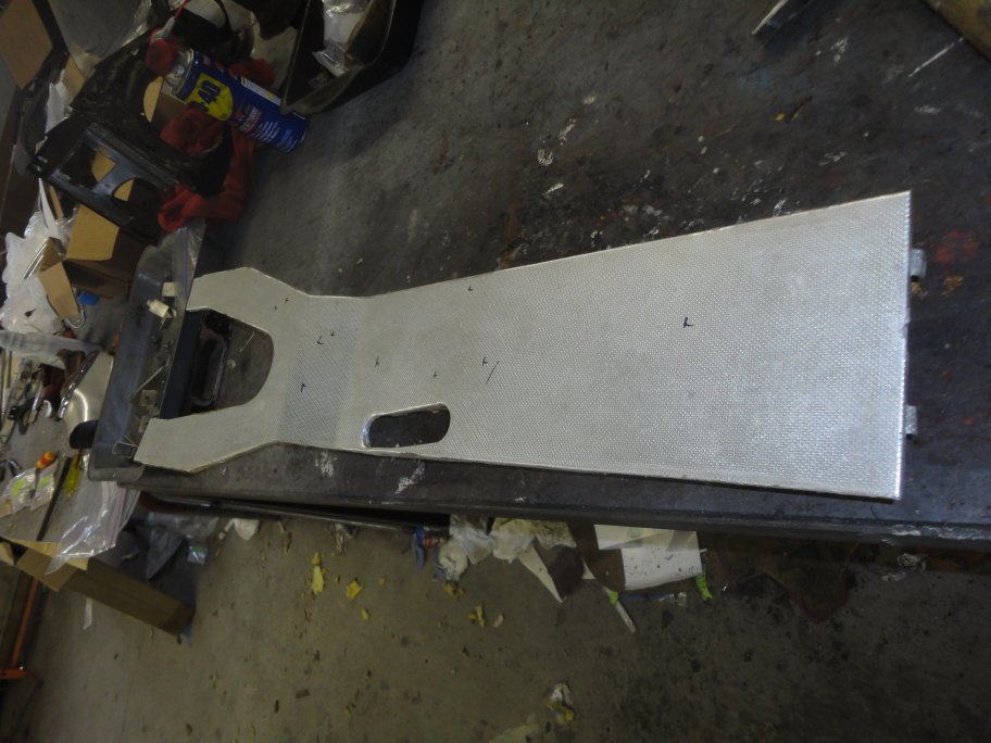 40) Here is the beat-up precious cross-hatch patterned aluminum center section ready for repair. The first step is to identify any dings in the metal, which requires removing the aluminum from its plywood backer.