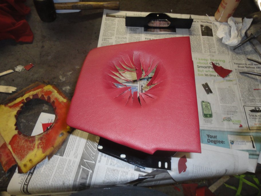52) The vinyl trim is glued in place only around the outer edges.The vinyl is cut into little wedges around the inside of the speaker hole and it too is glued from behind.