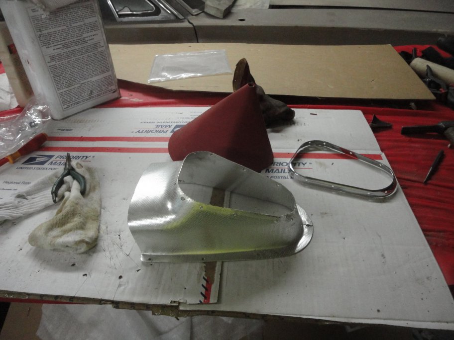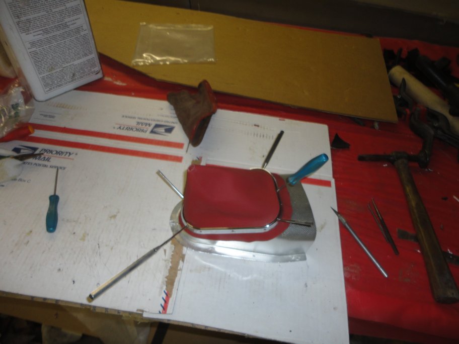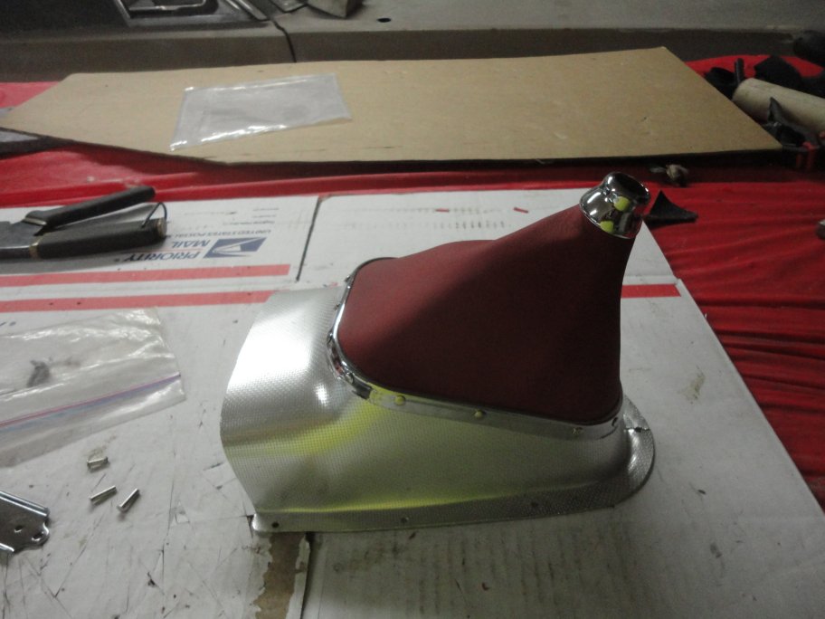 47) The excess material can easily be trimmed away by following the bezel with a sharp exacto knife. Then the chrome escutcheon can be treaded on for the final touch. The boot assembly can then be simply installed into the console and attached using 6 small screws from underneath.