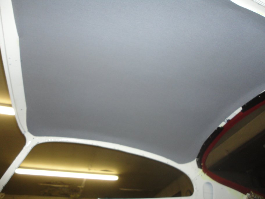 At this point I no longer needed the services on my assistance or the center line string. The headliner was free to safely hang from the roof. The next step was to simply remove the long strips of wax paper and brush adhesive on the headliner. Once the adhesive was tacky, I brushed the headliner in place from the center out (center to right, center to left). The result is pictured here. You may notice the the headliner sticks out beyond the inner roof rails. It has to, since the headliner must be tucked under the roof reinforcement.