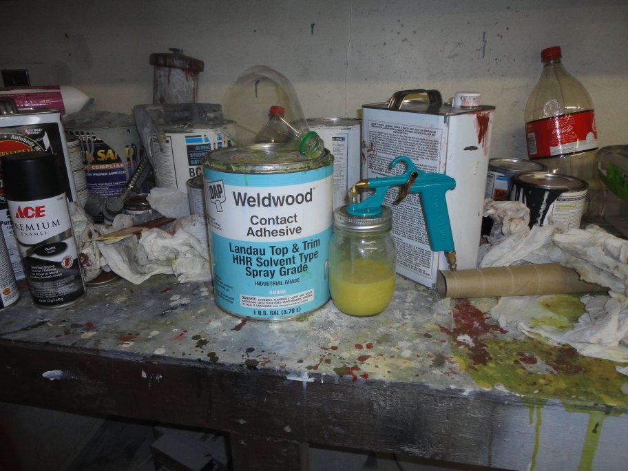 2) The real process begins with the installation of the headliner. The process is simple, yet tricky. The first thing that is needed is a good adhesive and a means for applying it. Generally, off the shelf adhesives do not stand up to the heat from the sun, which will cause the headliner to detach from the roof. I took the advice from several members of the Jag-Lovers forum and bought a gallon of Weldwood Landau Top & Trim Adhesive. I used the Solvent type. As a rule "if it is bad for the environment, it works better". To apply it I used a Critter Spray Gun that I got from Amazon for $35. I wouldn't paint with it ,but it works great for spraying adhesive.