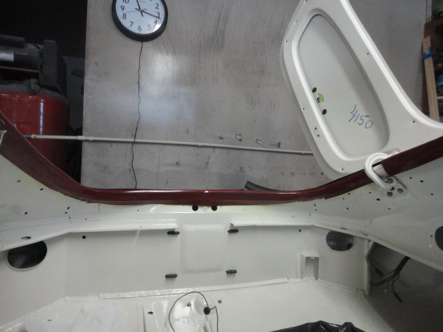 1) As with all car interiors it seems that the interior installation is performed from the top down and with no glass installed on the vehicle. In the case of early E-type Jaguars, (maybe later ones as well), it also means that the roof rail weatherstrips must not be installed either.