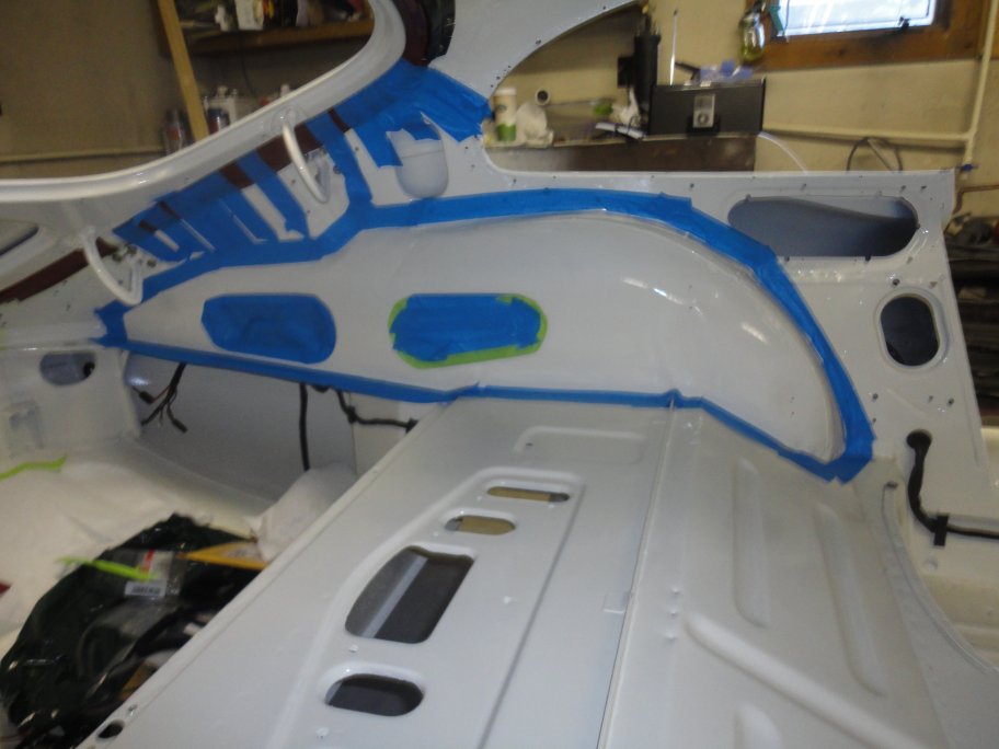 14) The next big part in the process was the covering of the wheel arches. The arches are first covered with foam. The perimeter was masked off. You will notice that there are two recessed <