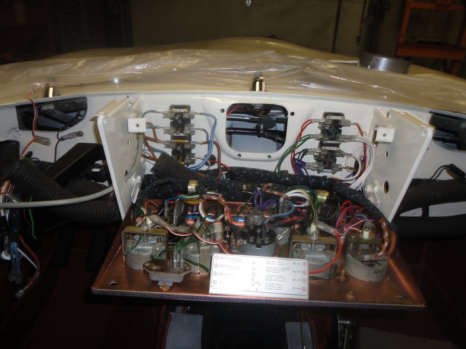 In this picture you can see the center gauges and fuse terminals after installation. I had the center panel plated in copper by Paul's chrome. The gauges were cleaned and the bezels were repainted. I left the original 1962 date makings on the gauges.
