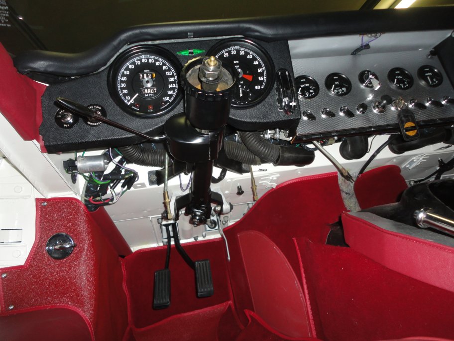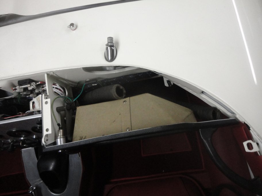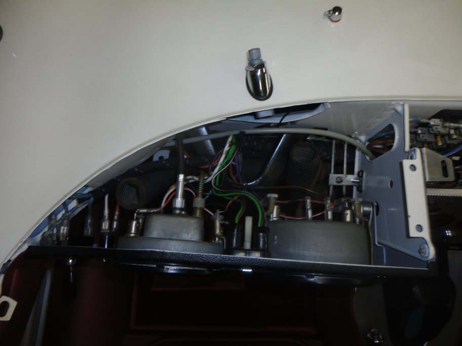 61) The glove box panel must be installed in conjuntion with the choke cable. On early E-types such as this, the grab hand must be installed prior to the dash pad. This is becuase the handle bolts through the panel. Later on in production a chrome bracket was bolted to the panel as a base for the grab handle.
