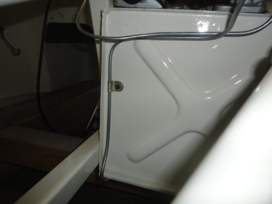 51) The front portion of the rear brake line is mounted to the front of the bulkhead with a bolt that musted be nutted from the inside of the car. This must be done prior to glueing in the footwell padding.