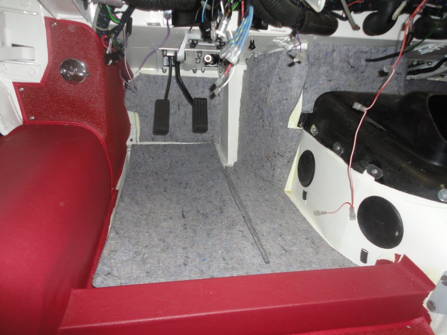 56) On the driver's side, a carpet section is glued to the jute padding at the front of the transmission tunnel and on the face of the bulkhead. Then the transmision tunnel piece is just snapped in place. After that, the carpet for the floor is dropped in place and is only retained with the forementioned male plastics snaps (not shown).