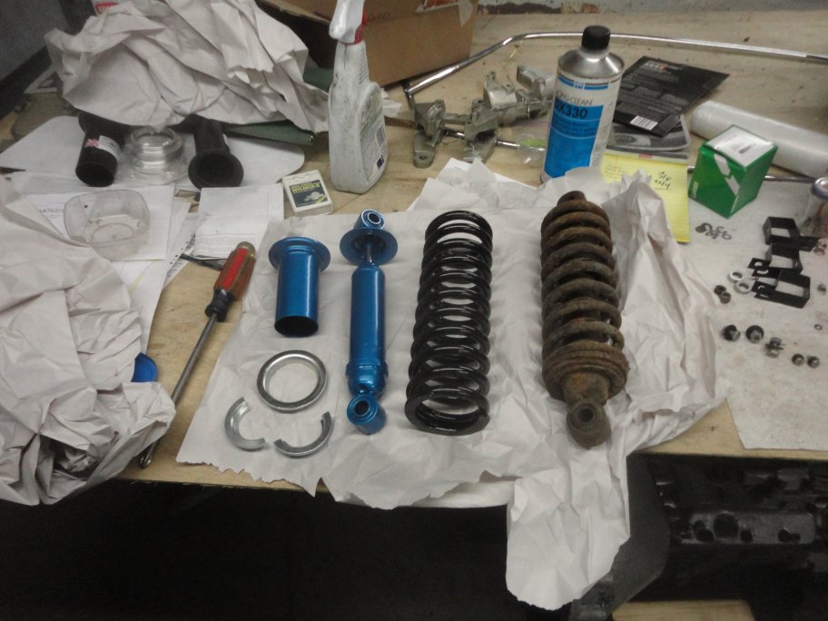 1) For the rear shocks there is no point in saving any of the original components unless they are in really nice shape. Every piece can be bought new. All you have to do is put them together. Original Girling brand shocks are not available, but the Boge aftermarket shocks are really close in appearance. If you cannot save the original dust shields from the original shocks, repos are available.