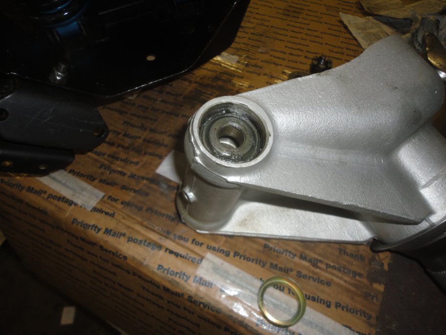 24) A stack of old spacers and the original nylock nut are installed. The nut is tightened down all the way. Unfortunately I did not take any pictures of the float measurement, so you will have to use your imagination. The float is measured by first mounting the hub assembly in a vise by a fulcrum shaft nut. A dial indicator is mounted on the opposite (free) end of the hub assembly and is set to contact the surface of the fulcrum shaft . Using a pry large screwdriver or small prybar, you pry between the vise and the hub assembly and measure the deflection of the dial indicator. Ideally it should read 0.005" +/-.002". If it doesn't then you will have to add or remove shims to get the proper float. Once set you take the fulcrum shaft