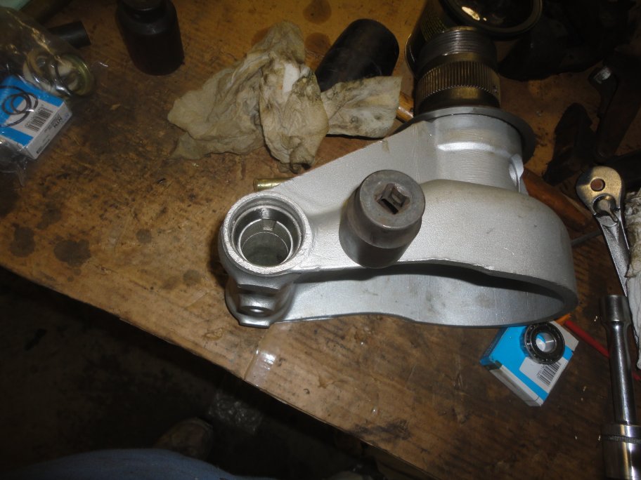 25) With the flaot set, the fulcrum shaft can come out and the bearings can be greased. It is recommended in the service manual to create a dummy shaft (less than the width of the hub assembly) to hold the tube spacers and shims in place until the hub assembly is installed. You could make one from a wooden dowel rod from your local hardware store. I just used a tapered punch to line things up during the assembly.