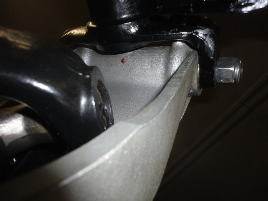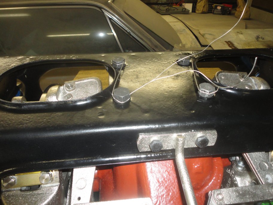 21) It takes some prying to get the radius arms in place over the cups that are rivetted to the floor. The final factory touch is to run saftey wire through the bolt heads and around the retaining straps.