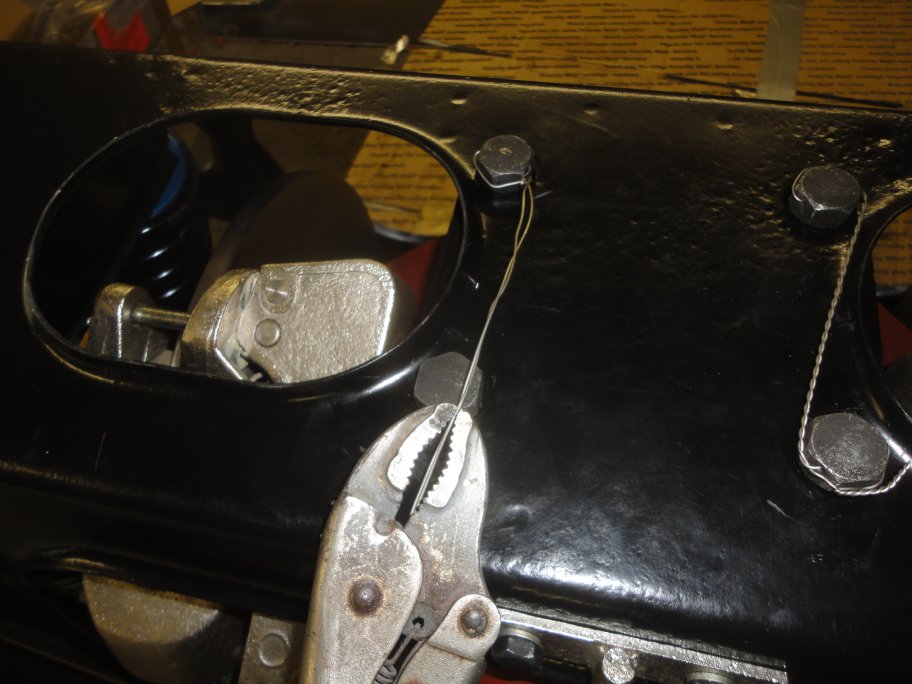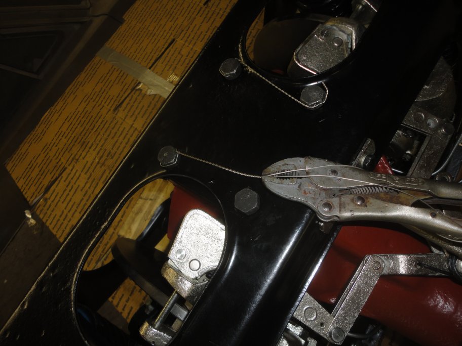 14) The vicegrips are released and one end of the wire is fed through the hole in the second bolt head. The other end is wrapped around the outside of the bolt and is twisted together with the other wire end. Again using visegrips.