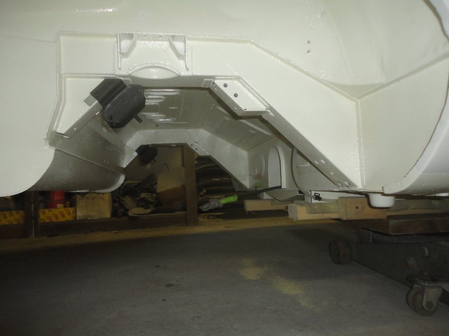 17) Finally the IRS can be installed and the car can go back on its wheel the first time in over 5 years. The first thing to do is install the rear IRS mounts to the frame. They can not be installed on the IRS first because there is no way to access the bolts on the frame. Note: It is also important to have the fuel line installed prior to installing the IRS, since the fuel line retaining clips can not be installed after the fact.