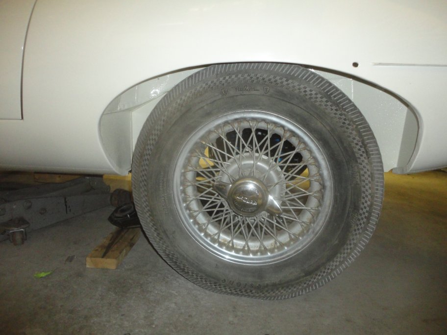 20) The wheels were installed and the jack was lowered to the ground. The full wieght of the vehicle is required to help bolt the radius arms. Note: I just love the sidewall of these vintage FiIrestone biasply tires. They have a very cool checkered flag pattern to them.