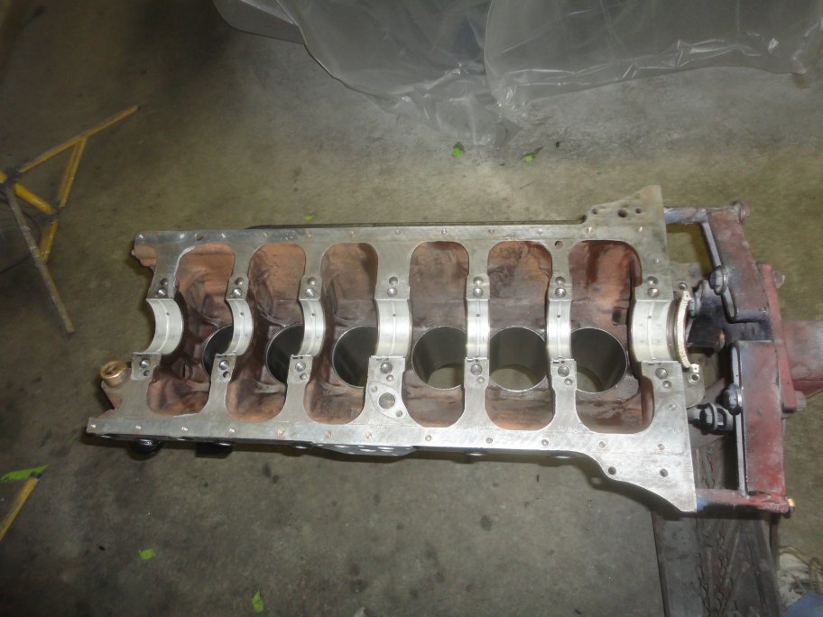17) Here it is with the main bearings inserted into the block. Some people like to coatthe inside of the block with glyptol to seal the pores in the block and get the oil flowing better, but the original factory primer looked pretty good to me.
