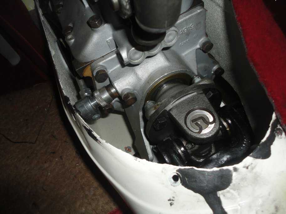 11) The driveshaft must be bolted from the inside of the car. This means the seats, console, radio console and transmission tunnel cover must be removed to reach the bolts. Since I had installed the console several months earlier, I had to removed it. TIP: It is a lot easlier to remove the console if the emergency brake lever is unbolted from the transmission tunnel (removed all bolts but the bottom right). The terrible thing about this design is you also have to remove the IRS if you need to change a universal joint on the driveshaft.