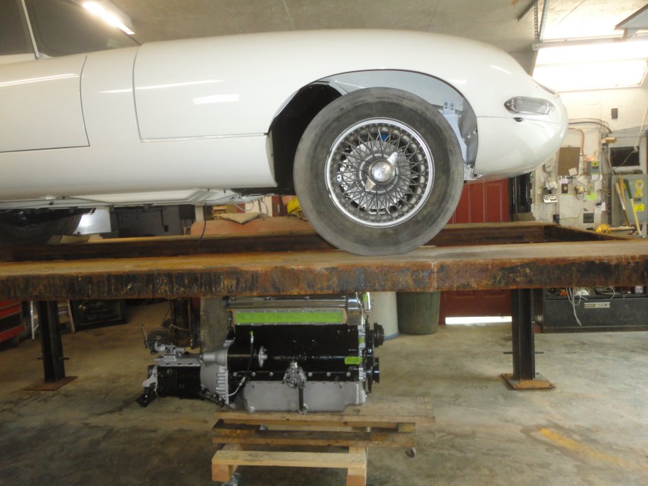 4) The engine was positioned in place below its home. Not very evident in this picture is the early style transmission mount. The early style mounts had two rubber shocks absorbers that were bolted to the transmision. Not long after the production of this car, Jaguar changed to a single spring mounting scheme.