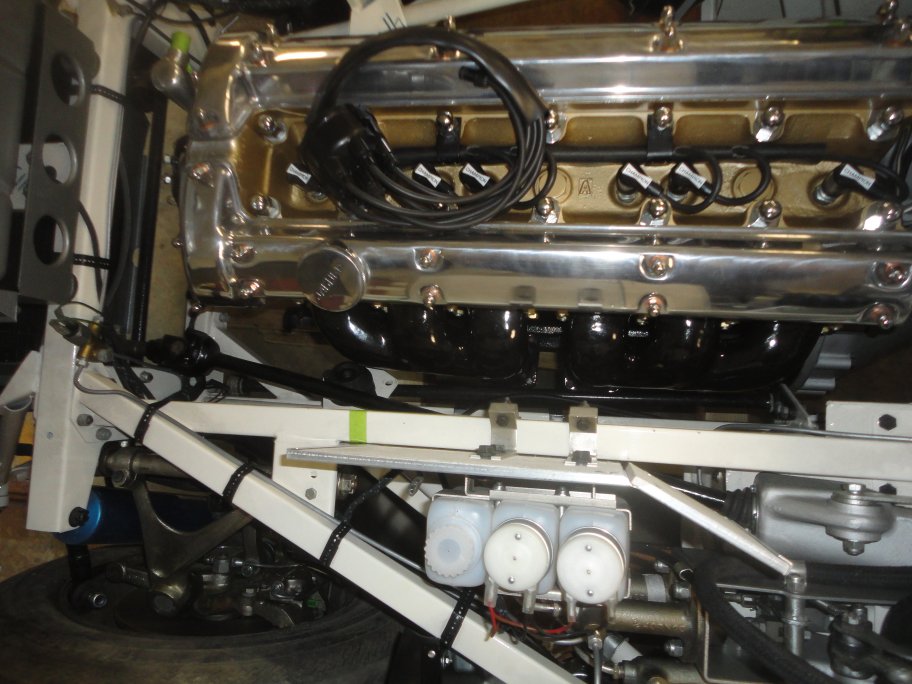 10) Here she is with the motor installed. This is the first time since February 2008 that its had an engine in it. It took me only 45 minutes to install the engine from the time I wheeled the engine under the car to the point where all of the mounts were bolted. Absolutely no paint was scraped or chipped during the install. Some people perform the bottom up install with the bonnet off and an engine hoist to raise the front. That method seems risky to me since there is a good chance of hitting the firewall and chipping the paint at the lower front sections of the engine frames, simply because the car is lowered in an arc instead of straight down.