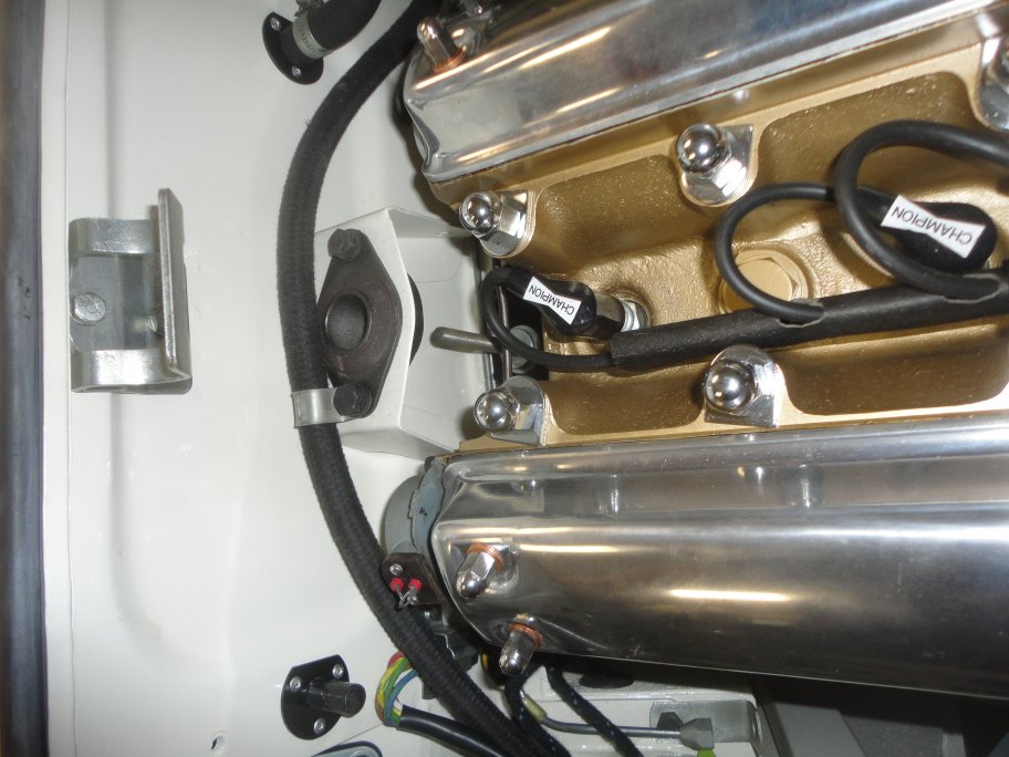 18) Here is the virtually completed engine compartment. The only thing missing in this photo is the hose clamps for the upper heater hose, the hose clamps for the timing cover vent hose, the metal fuel line to the carbs and the long accelerator linkage rod. All of those items are just waiting for me to plate them.