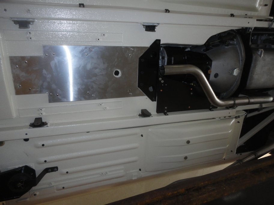 14) Before the exhaust went in, it was necessary to install the heat shields. I believe the original ones were made from asbestos. One of the heat shields (the silver one) is rivetted to the floor with 3/16" rivets. The underseat harduras need to be removed before drilling the holes for the rivets. The repo heat shield did not come with the large hole that can be seen in the picture. I had to add it to get the look of originality. I'm not sure what the hole is there for.