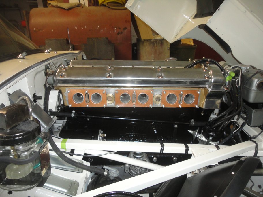 17) The carbs went in without drama. Though not visible in this picture, each carb has an overflow pipe that are joined together in a bracket that is bolted to the oil filter housing. (I did not know this at first until I recently saw a picture on the web. Over 5 years of work and studying early E-Types and I am still learning things!) My pipes had been cut back by a previous owner. At least I still had the original bracket and the overflow pipes are still being produced.