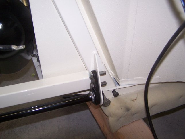 13) I opted to assemble my front suspension, including setting the torsion bars to their original setting long before the engine went in. In order to do this I had to insert these bolt cut-offs, recommended by the service manual, into the toggles at the ends of the torsion bars. This meant that the torsion bars were loaded when the engine went in. The only way to install the reation plate was to removed the load by dismanlting the front suspension. So I had to jack the front end up, pop the upper ball joints, remove the lower shock bolts and unbolt the sway bar. (The tierod ends were already unbolted). Even with the loading removed it was still a battle and I do mean "battle" to get the reaction plate in. A lot of it had to do with the fact that I had installed new floors and the channels where the engine frames went were sloppier than the original ones. Meaning the engine frames could be moved inboard to outboard.