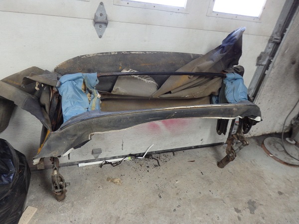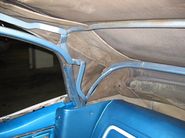 Here is the manual convertible top as I received it with the car. It had obviosly been replaced at least once. The current top was white that was spray-painted black. With the top material removed there was plenty of evidence that the top was originally blue. That and the C-4 code on the car's trim tag. There was very little blue top material left on the frame. Just a little across the header bow and a small piece on the rear tack strip. Though the blue seemed kind of light compared to what I was expecting.... The pads were obviously blue. There was some blue cloth remnants on the 2nd bow. This is evidence that the underside of the top would have been blue as well. Many blue top cars came with blue frames. This frame was black. It obviously was not repainted as the original Manual Top decals were still in place. I did read on the web that some original cars were found with blue tops and black frames. No correlation between blue frames and balck frames based on standard versus deluxe interiors or manual versus power tops have been identified yet. |