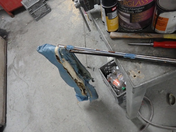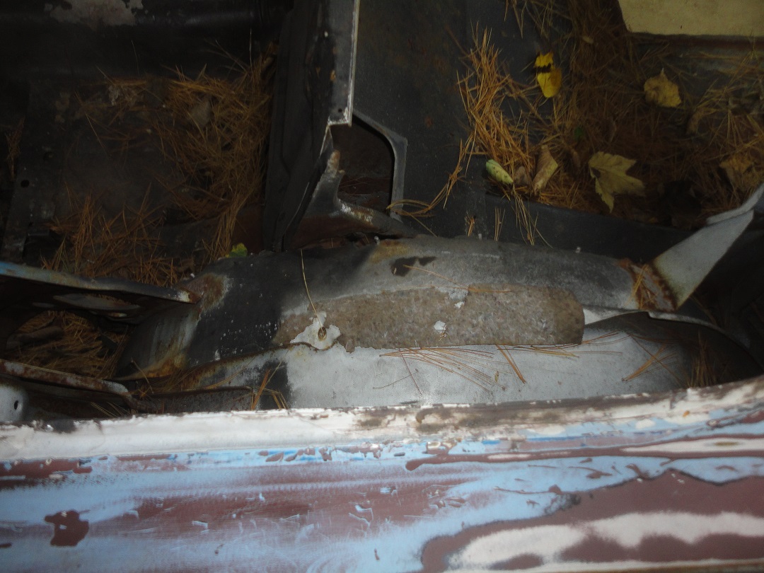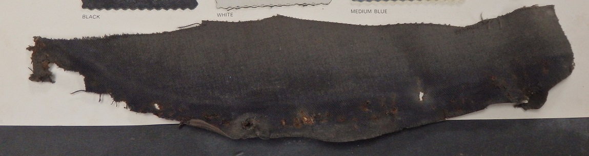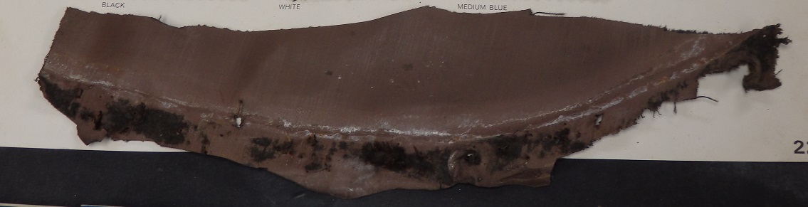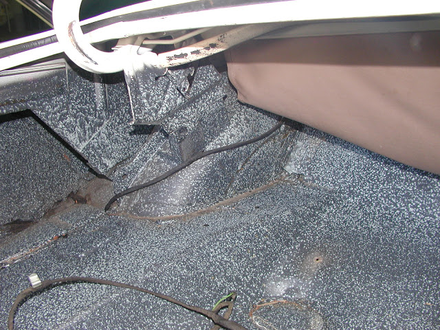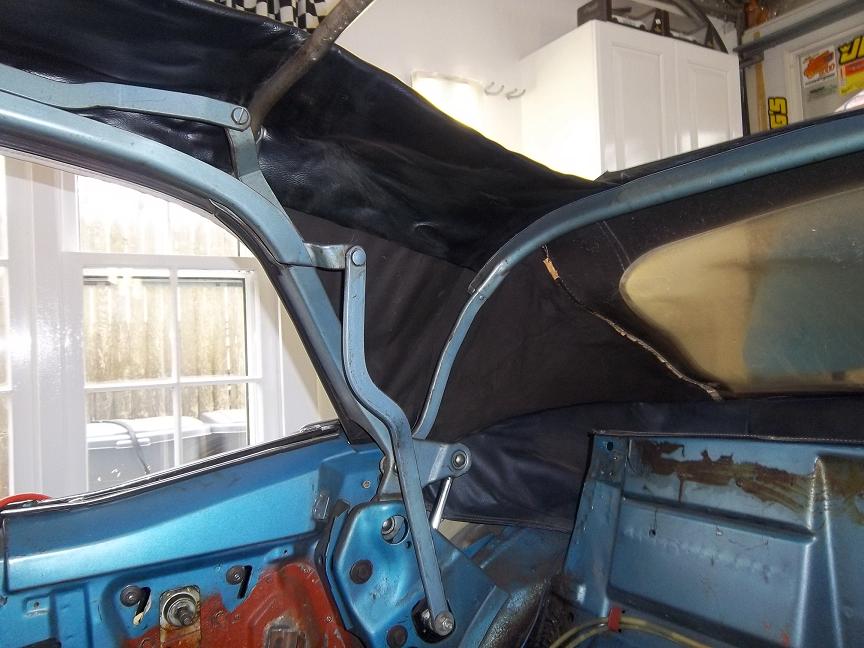In the above pictures you can see the remnants of the car's original well liner. It's a black cloth material (not vinyl) that has a kind of a beige-ish tan rubber coating on the underside. The picture on the right is of an original well liner from a car restored by Lucas Restorations. I was to find out later that the well liner material, like the blue top, is not made anymore. |