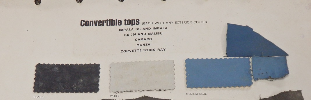 ![]() For the past several years I've been searching the web for blue top 1967 Camaros. Here are all of the cars I found that potentially have an original top on them.They all appear to have a light blue top. I also came across this vintage picture, showing a car that had a light blue top on it as well: ![]() I have come across a couple pictures of restored 1967 Camaro Pace Car Replicas that have replacement medium blue tops that look like the Dave Welday's car: As mentioned before, there were remnants of a blue top on my car when I removed the top. There wasn't enough to prove that the blue material was original. The only recourse was to spend big bucks to buy 1967 Chevy Dealer Showroom Catalog, which comes with actual trim samples. I compared piece of the material I took off the top frame and a sample of the new top material and it appears the lighter material that was on my top frame is the original material and it is lighter then what I bought. Well I'm stuck wiht it now. Let's say I have increased my doubts about buyings stuff for a gold certified judge................. ![]() |