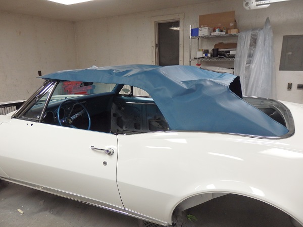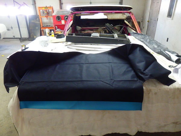 Finding a blue convertible top was a challenge as the material isn't being made any more. I ended up paying extra money to have Camaro Specialities order me one. They ordered it from Electron Top. The top I got I believe is a bit darker than the original, thought it looked pretty good layed out in place. I pondered the color issue for a while and posted some questions on some of the classic Camaro websites. No one seemed to think it was wrong, but they are pretty hard to come by in blue and who really remembers the shade of blue from a car built 50 years prior? Since I couldn't get the 100% correct color, including the underside color and pad color, I decided to install what I could get. Right or wrong. The first thing that goes on for the top installation is the well liner. No one makes well liners with the original material, again probably because it is not available. The picture on the right is the one I bought from Camaro Specialities, though I bet all of the vendors sell the same one. The inside material is correct, but the outside face (not shown) is black vinyl. |