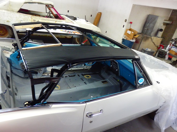 Prepartion for installing the convertible top involves aligning the frame to the car (if you removed it) and making a pair of spacer blocks for holding the rear bow the correct distance from the third bow. The dimensions come out of the Fisher Body Service manual. 13-3/16 from the center of the round bow to the top face of the rear bow. The pads are were the first to go on. They are stapled at the front and rear, stapled at the 2nd bow and screwed to the third bow). The well liner gets stapled to the rear well tack strip prior to installing the rear window (not shown). Installing the rear window was a major pain to do right as the plastic window kept wrinkling on me. The only advice I can offer is to staple it across the top and then staple it on one side at the bottom corner, pull it tight while stapling it at the other bottom corner, bolt it in, mark it, unbolt it, tack staple it and repeat. I'm sure I had bolted and unbolted it a dozen times or more to get it right. Installing the top was relatively easy. I just followed the instructions in the Fisher Body Service Manual. It takes a lot of practice to get it right, so I don't have much advice besides following the book. I have installed a few tops prior, including the top on my 1969 Firebird, but back in 1998. |