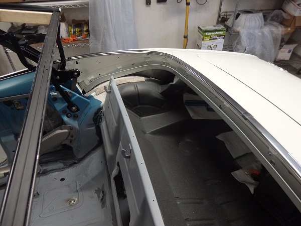 ![]() The original windshield header moldings were restorable, so I had them replated by Paul's Chrome. I also had Bright Works Restoration fix the small dents and polish the stainless windshield pillar moldings and the convertible well moldings. The factory really loaded up the windshield area with gray putty to seal things up. I used plumbers putty in this area as well since it pretty soft initially and does a great job sealing things. The original convertible sunvisor brackets were too bad to use, so I went with repos. The repos do not fit as good around the windshield pillar moldings as the originals. |