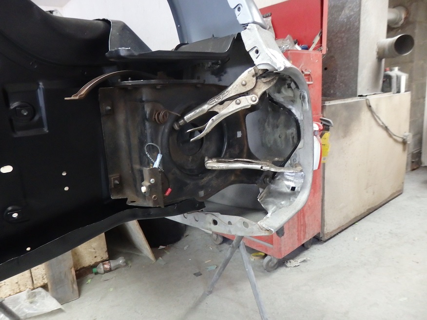 The next challenge prior to filler work was to convert the fender to RS style. The 67/68 style setup requires special brackets to be welded to the front fender opening. To install the bracket correctly