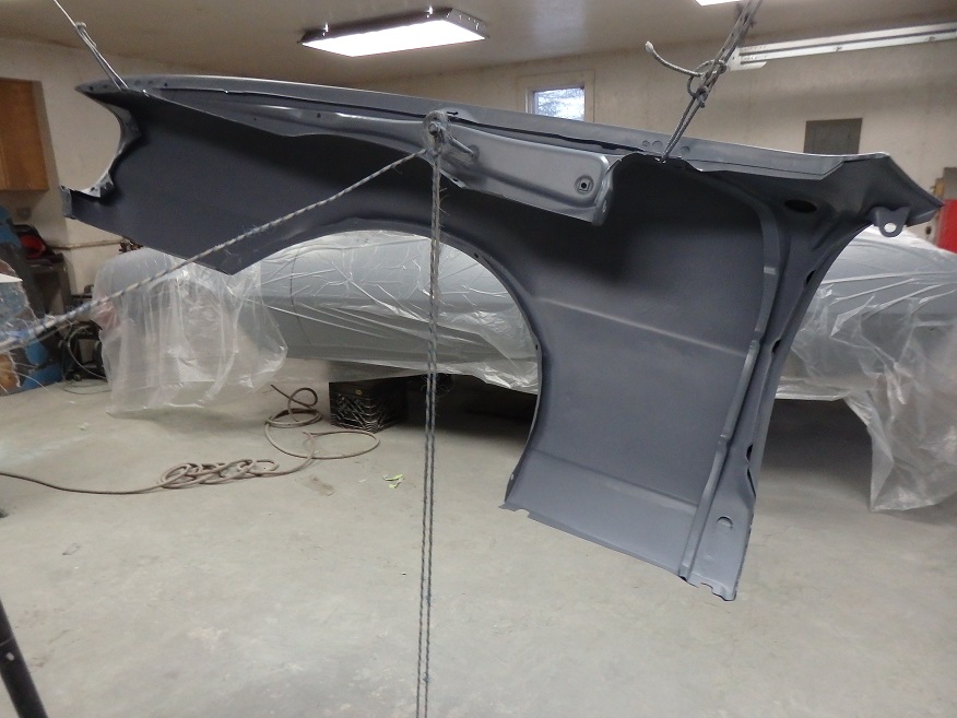 With the filler work completed, I hung the fender from the ceiling and epoxy primed the whole thing.