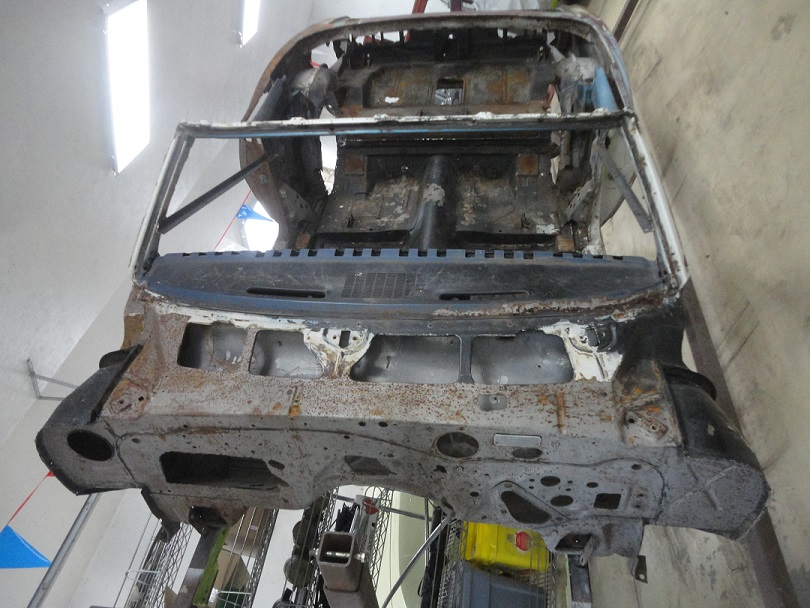 The second picture is what it first looked like when I put it on my rotisserie 2 years later. In this picture I had removed the frame reinforcements that were welded in to stiffer the car for drag racing.