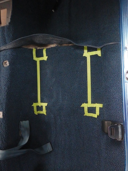 mapped out the edges of the track feet with tape. After taking these seats out I marked the long cut line with tape, and then cut the carpet. The front carpet doesn't get cut. It jsut lays on top of the front seat bolts.