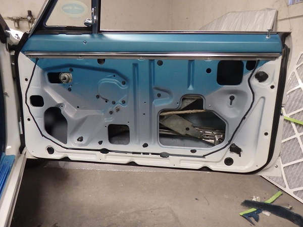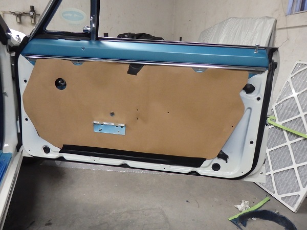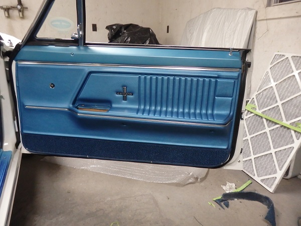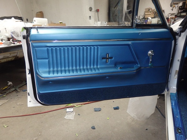 The door panels were made by Al Knock. I sent the lower carpet sections, which came with the ACC carpets, to Al Knock to install. The trim along the carpet on the door is supposed to be dasrk blue. All the big repo places use trim